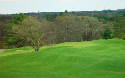 Target mounds on right. Be careful not to drive through fairway, mystic lake comes in to play on right. Long hitters can fly trees on left with a well struck long iron or fairway wood. Green slopes toward the fairway and is elevated. Add about a half club on approach.