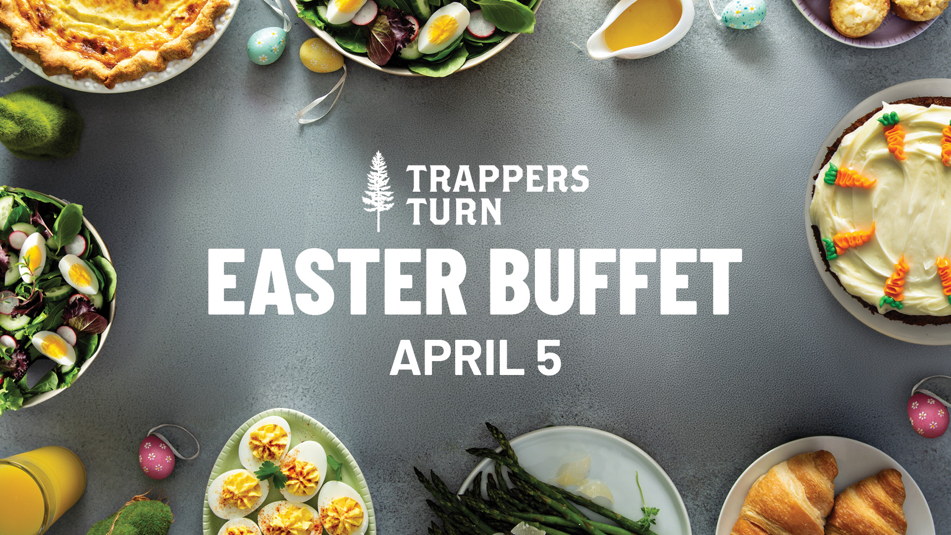 Hop on over to Trappers Turn this Easter and join us for our annual Easter Buffet. An all-you-can-eat celebration featuring all your breakfast favorites, mouthwatering chef-carved meats, and an endless selection of sweet treats.
