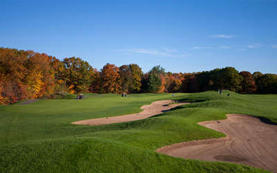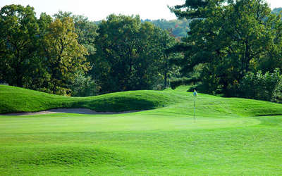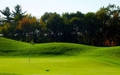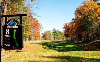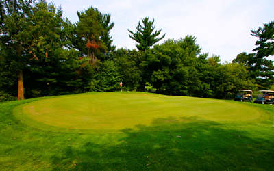 One of three great finishing holes; long and narrow flanked by oak and pine trees. The slight dogleg right requires a left to right or straight shot from the tee. An ample sized green is guarded by bunkers front and left.