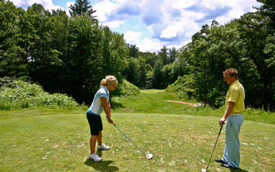 The "Canyon" hole is more forgiving than it looks. An errant shot will often carom or funnel towards the green. An elevated tee requires one club less than normal.