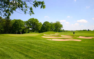 Aim left center of the fairway to avoid bunkers on the right. Mounds on left will often bank drives back toward fairway. Long iron or fairway wood off the tee for big hitters. Green slopes toward fairway and is guarded by bunkers on right.